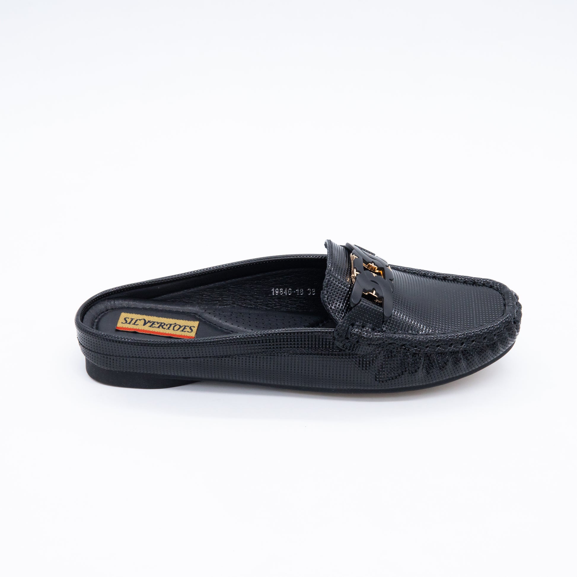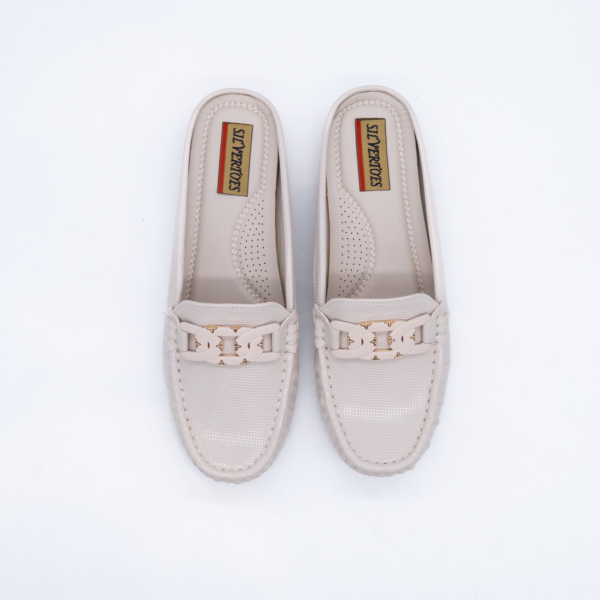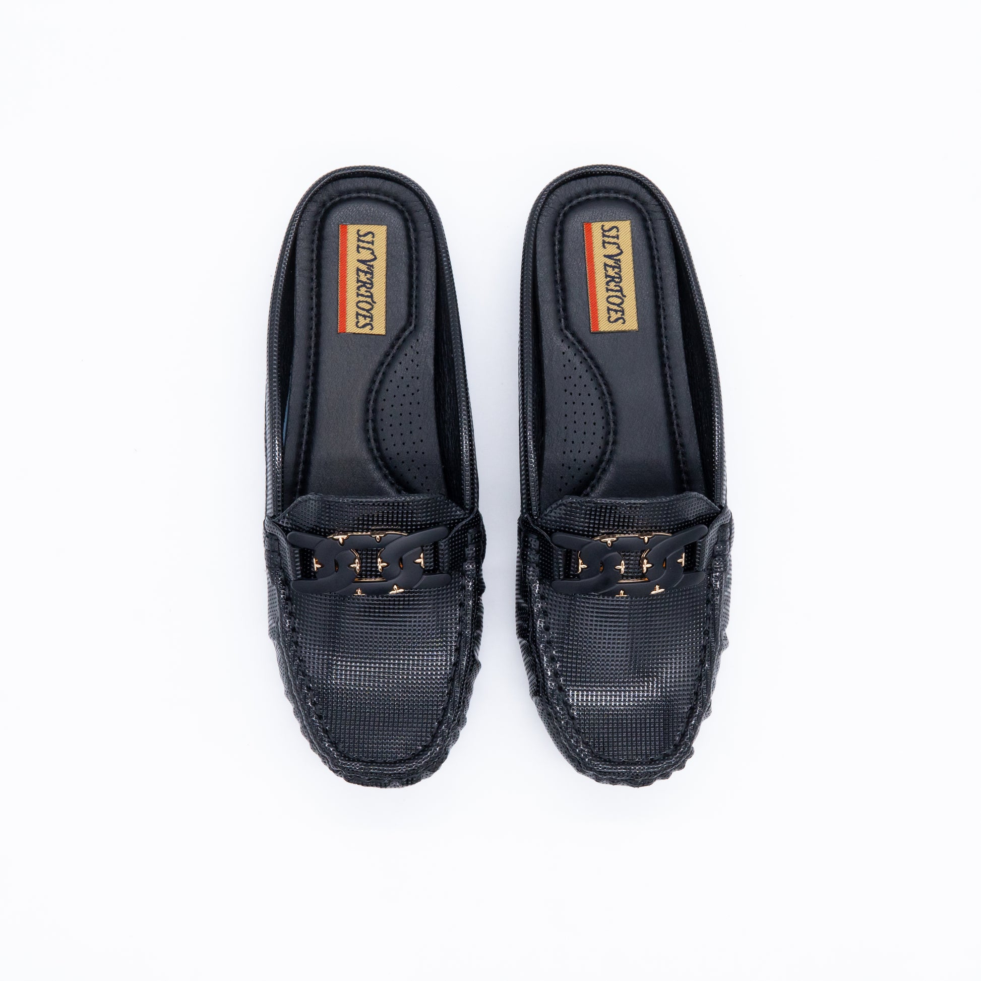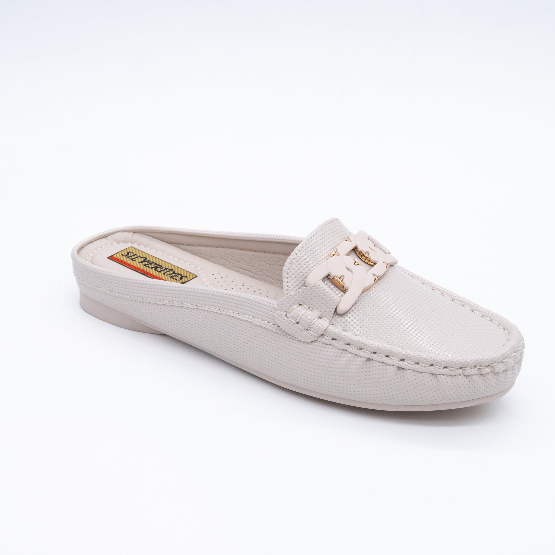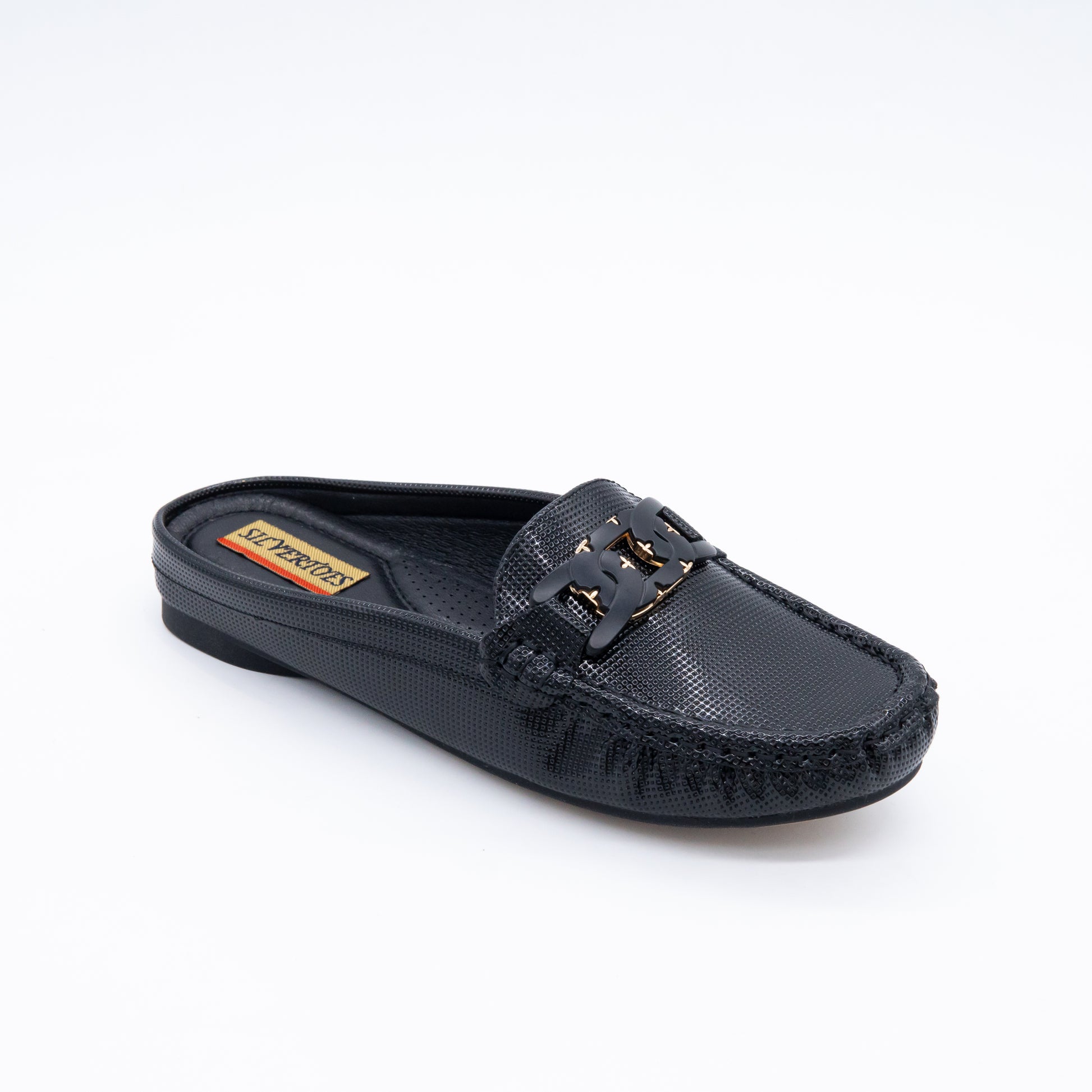 Effortlessly refined—these casual mules blend comfort with sophistication, featuring a soft fly upper and a gold-toned buckle .
