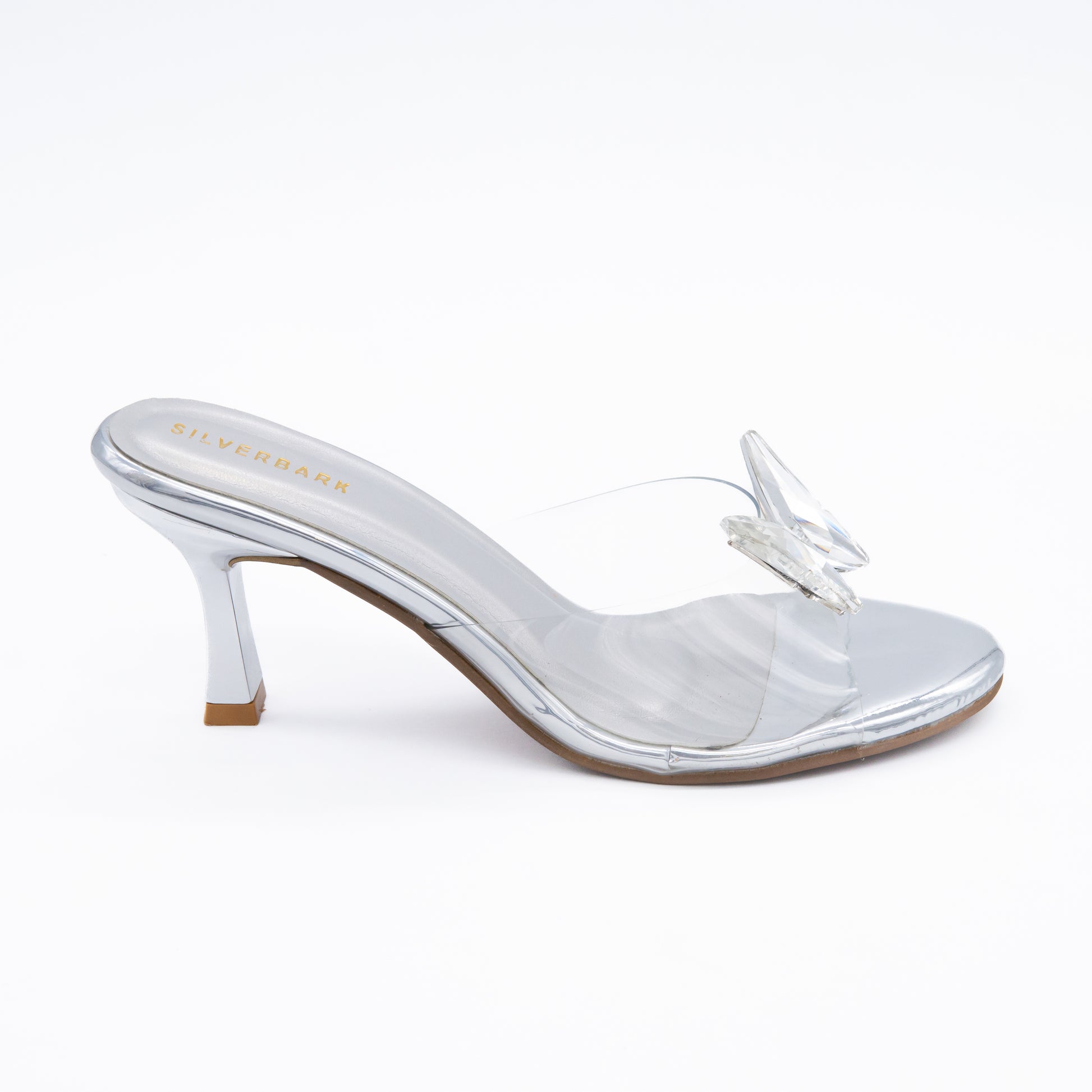3 INCH OVAL HEEL WITH A TRANSPARENT UPPER AND A BUTTERFLY SHAPED BUCKLE