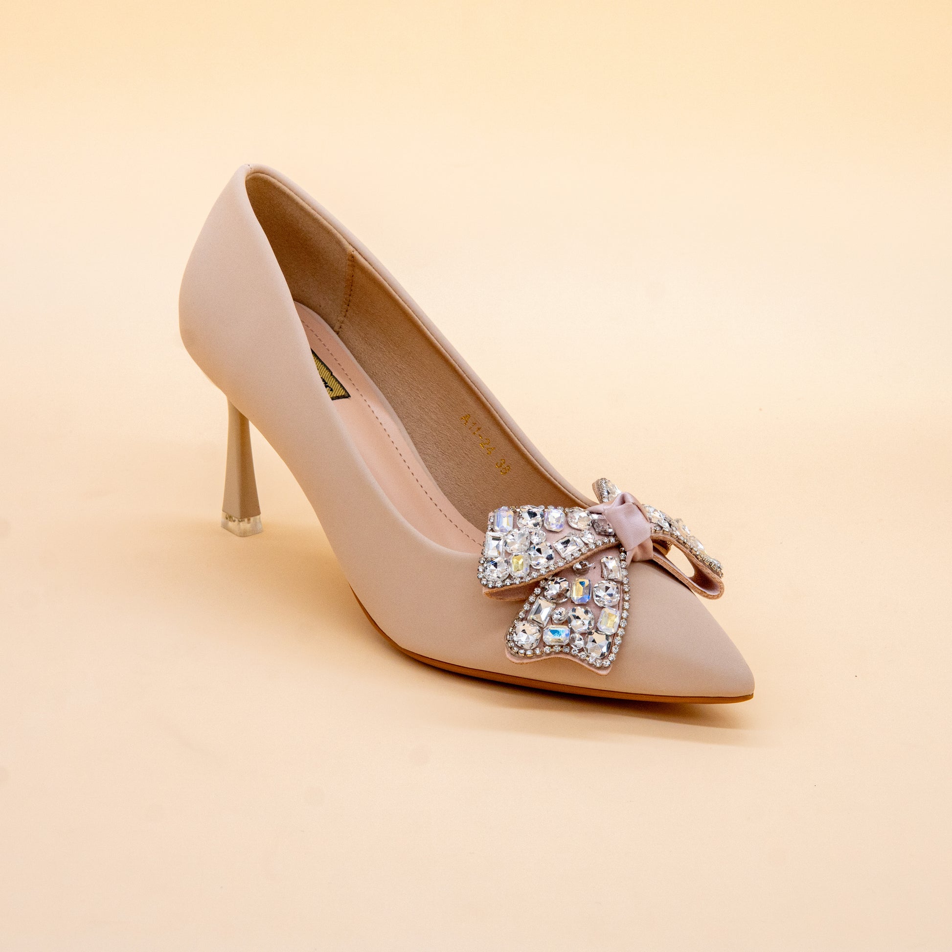 Step into timeless elegance with these satin pointed-toe pumps, designed to make every occasion unforgettable. Featuring a sleek silhouette and a comfortable mid stiletto heel, these heels blend sophistication with wearability. The highlight is the statement crystal-embellished bow on the toe, adding just the right amount of sparkle and glamour. Perfect for parties, weddings, or evening outings, these heels will instantly elevate your look with refined charm.
