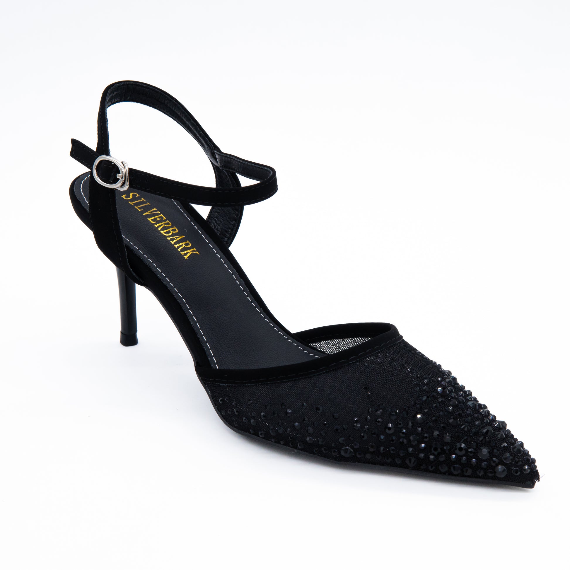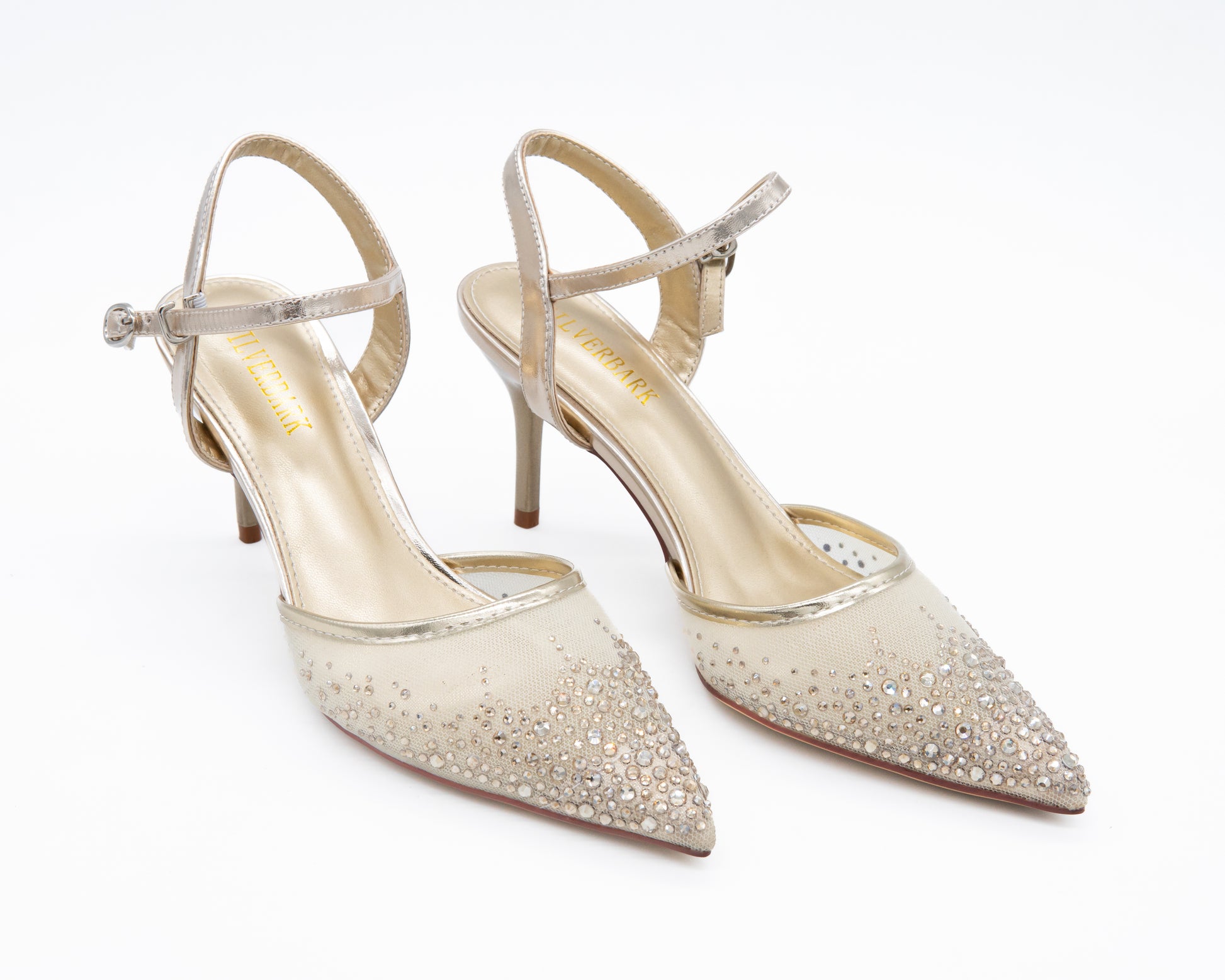 This footwear is designed to make your evening unforgettable, adding a touch of enchantment to every step. This close -toed evening sandal is the perfect finishing touch to your most elegant looks, ensuring you feel radiant and confident at every special occasion. The softly pleated mesh, adorned with light-catching hot fix crystals, sparkles beautifully, while the mid-heel offers both poise and comfort. The delicate miler ankle strap adds a luxurious detail, providing a secure and elegant fit. Whether you're attending a wedding, gala, or formal soirée, let the heels complete your look with style and grace, ensuring you shine through the night.